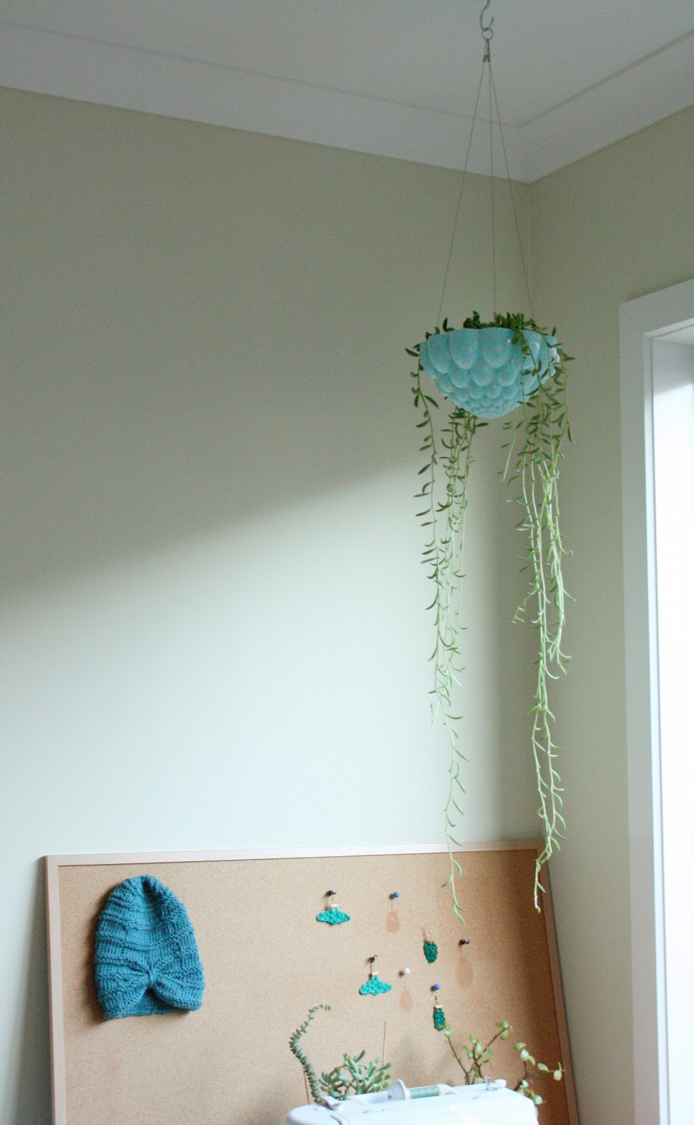 Just a really simple single crochet type of rug.Here is the free pattern.I also finished painting and writing all our save the dates. Each save the date is of different plants that both Aaron and I love. I drew each pattern in duplicate, one for my invites and one for Aaron's invites.It seems to be a weekend of tying up loose ends because Aaron screwed the hook into the ceiling for me so I could hang up my string bean succulent: